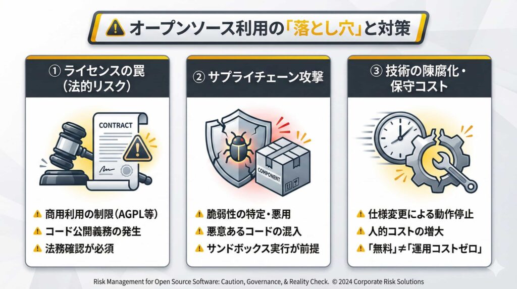公開されたコードは透明性が高い反面、攻撃者に脆弱性を特定されやすいリスクもあります。また、依存する外部ライブラリに悪意あるコードが混入する「サプライチェーン攻撃」の脅威も無視できません。商用ツールのような保証はないため、脆弱性スキャンの定期化やサンドボックス環境での実行など、自社責任での強固な対策が求められます。