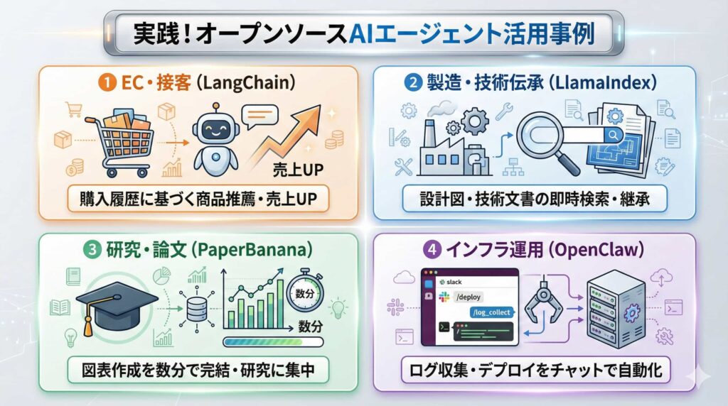 実際にオープンソースを活用して、どのようなAIエージェントが構築されているのでしょうか。その具体的な事例を紹介します。