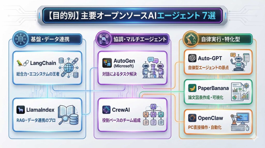 オープンソースのAIエージェントは、汎用的な「LangChain」から、学術特化の「PaperBanana」、PC操作実行型の「OpenClaw」まで、多様な進化を遂げています。