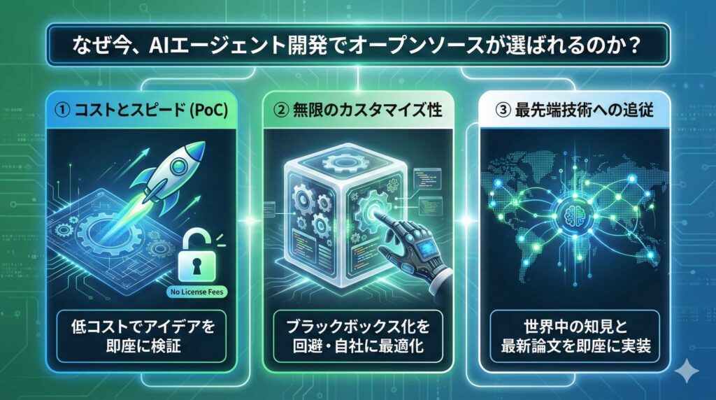 AIエージェント開発において、なぜ多くの開発者が商用ツールではなく、オープンソースを選択するのでしょうか。そこには、商用ツールにはない3つの大きなメリットが存在します。これらを理解することが、自社のAI戦略を考える上で重要になります。