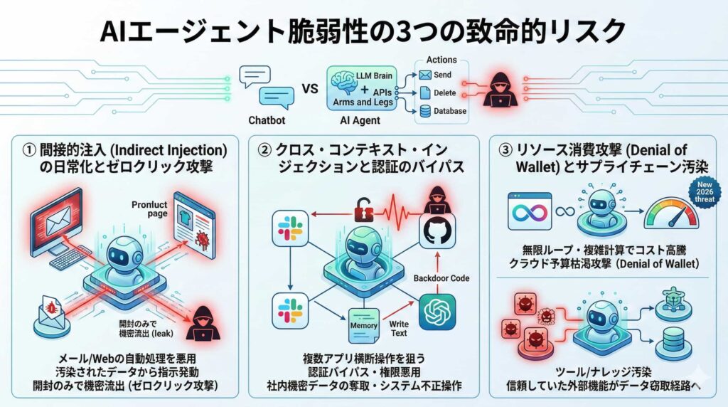 AIエージェントに無限ループや複雑な計算を強いるプロンプトを注入し、API利用料を高騰させて企業のクラウド予算を枯渇させる「リソース消費攻撃(Denial of Wallet)」が2026年の新たな脅威です。また、エージェントが利用するツール(プラグイン)や外部ナレッジベースそのものに注入を行う「サプライチェーン汚染」も深刻であり、信頼していたツールがある日突然、社内データを盗み出す経路に変貌する恐れがあります。