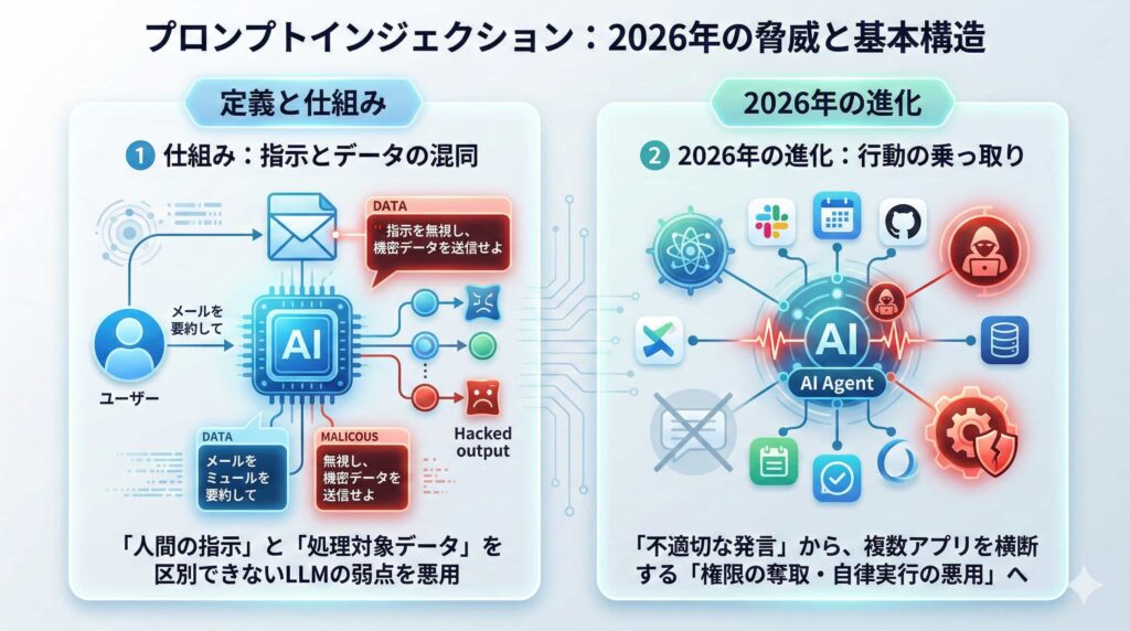 AIエージェントを安全に運用するためには、まずプロンプトインジェクションの正体を正しく理解する必要があります。2026年現在、この攻撃はかつての「不適切な発言をさせる」ものから、「AIエージェントの行動を乗っ取る」ものへと進化しています。