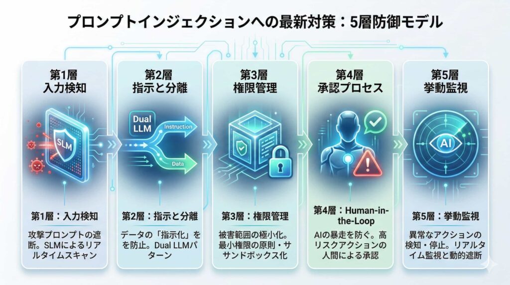 3. プロンプトインジェクションへの最新対策(2026年版):5層防御モデル