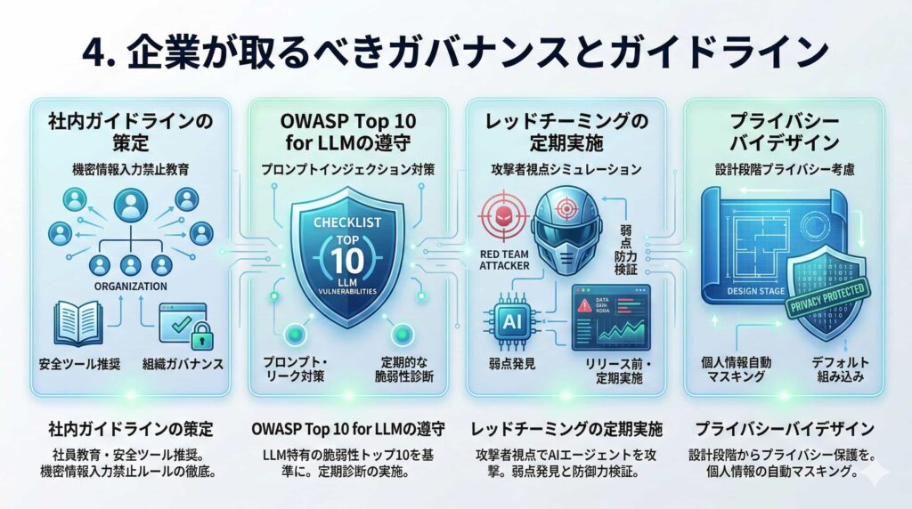 社員が機密情報をプロンプトに入力しないよう教育し、安全なツールの利用を推奨する組織的なガバナンスを構築する。