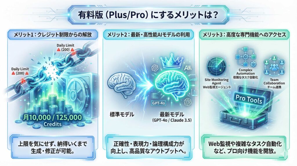 無料版から有料版(PlusまたはPro)にアップグレードすると、作業効率やアウトプットの質を大きく向上させるメリットが得られます。主な3つの利点を紹介します。