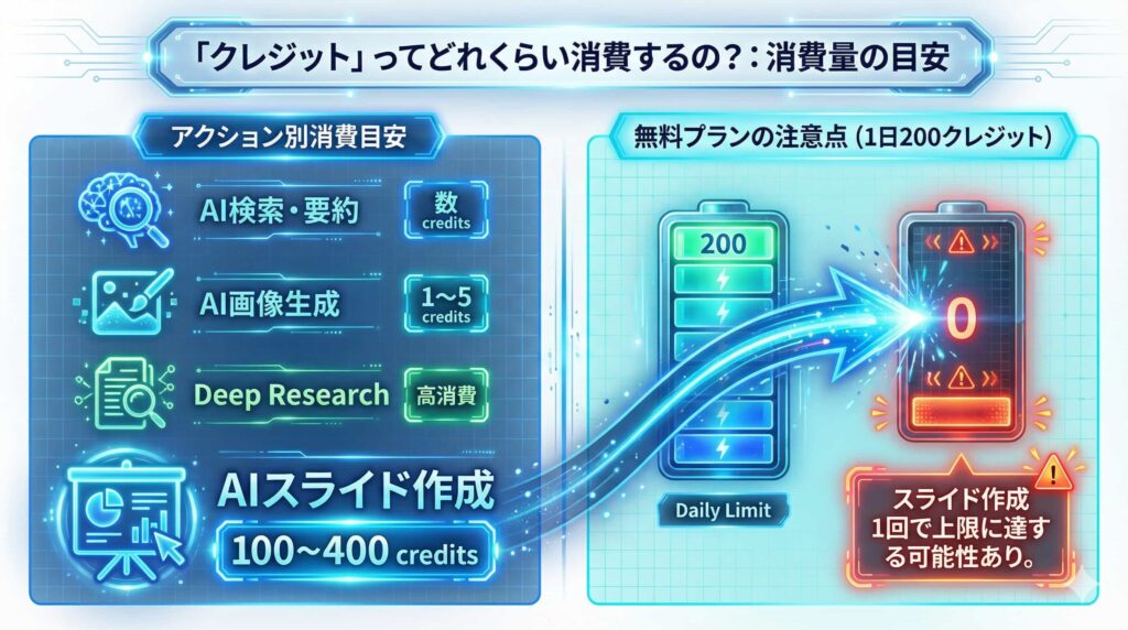 Gensparkでは、検索やコンテンツ生成などのアクションごとに「クレジット」が消費されます。プラン選びの参考になるよう、具体的な消費量の目安と注意点をまとめました。