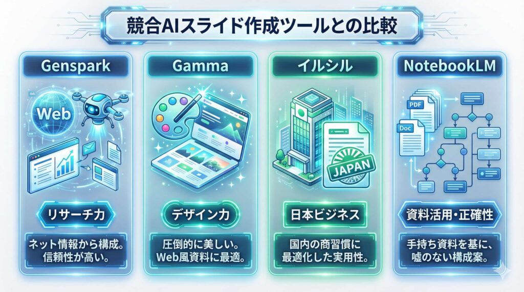 スライド作成機能に特化して見れば、デザイン重視のGammaや日本特化のイルシル、既存資料活用に強いGoogle NotebookLMといった強力な競合も存在します。しかし、「リサーチから資料化までをワンストップで自動化できる」という点において、Gensparkは唯一無二の存在です。