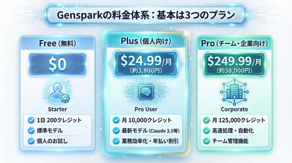 Gensparkの料金は、利用可能な「クレジット」の量と、アクセスできるAIモデルの種類によって決まります。クレジットは検索や生成のたびに消費される通貨のようなものです。