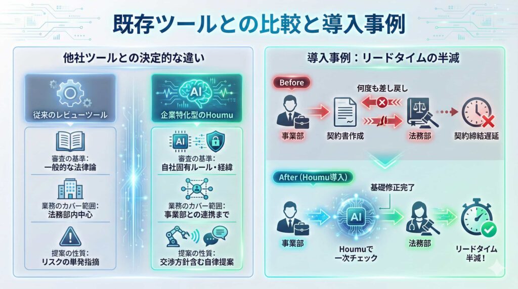 市場には様々なサービスが存在しますが、自社に最適なものを選ぶためには違いを正しく理解する必要があります。他社ツールとの比較や、実際にHoumuを導入して成果を上げた企業の事例を見ていきましょう。