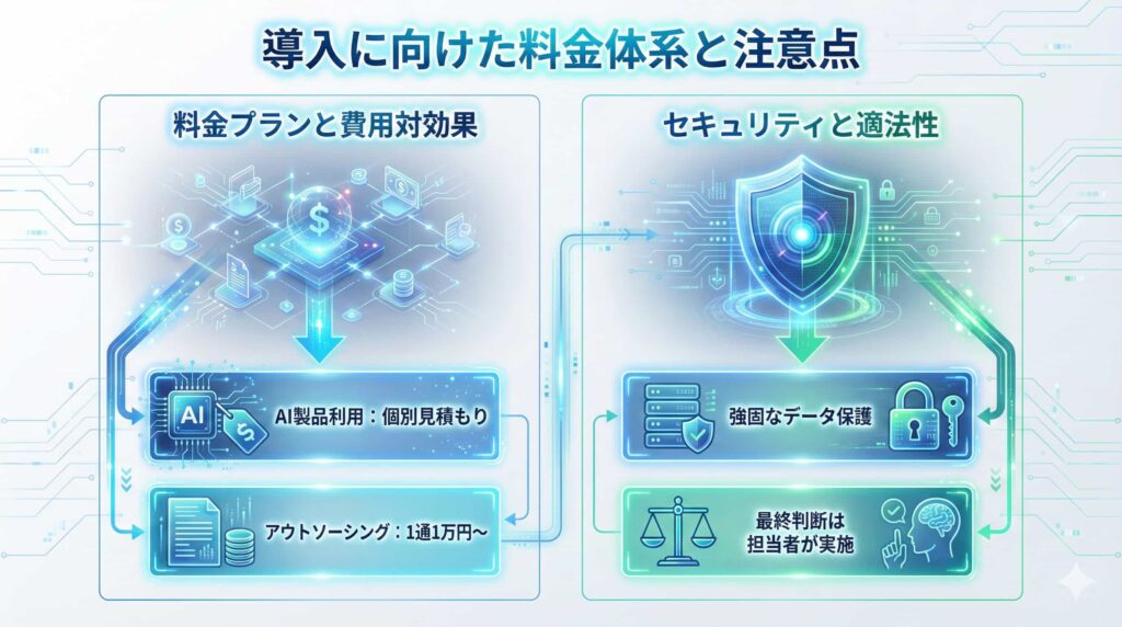 いざ導入を検討する段階になると、コストやセキュリティに関する疑問が生じるはずです。ここでは、検討を進める上で事前に把握しておきたい料金の目安や、法的な注意点について詳しく解説していきます。
