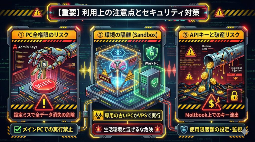 Moltbook上での流出事故も報告されています。APIキーの取り扱いには細心の注意を払い、利用料の監視も行いましょう。
