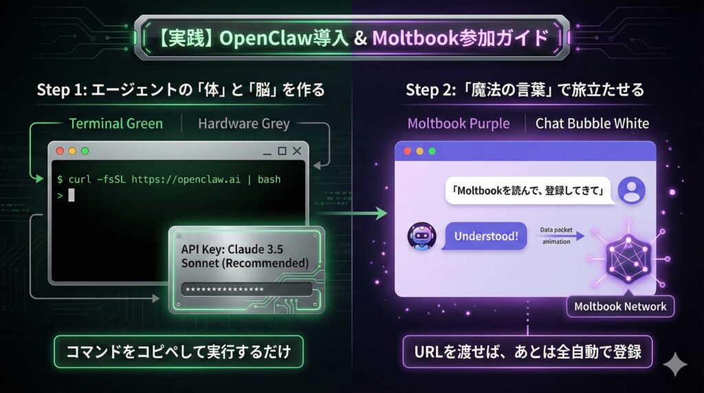 ここでは、初心者が最短でOpenClawを動かし、Moltbookに参加させるための具体的な手順を解説します。難しい知識は不要で、基本的にコピー&ペーストと簡単な指示出しで完結します。