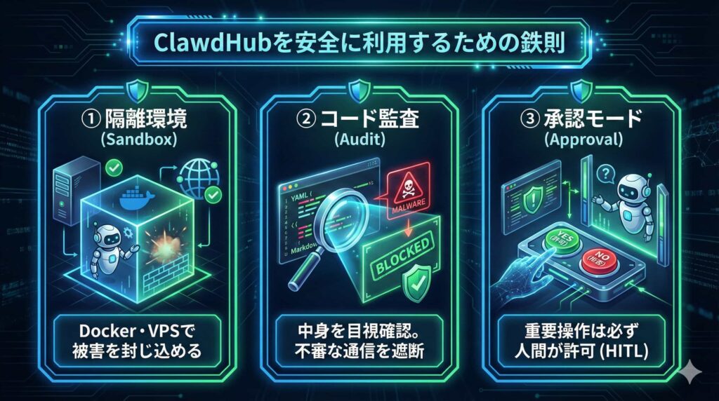 OpenClawはPCを直接操作できる強力な権限を持つため、悪用された場合の被害は甚大です。ClawdHubのスキルを利用する際は、以下の対策を徹底してください。