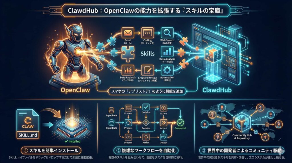 1. ClawdHubとは?OpenClawの能力を拡張する「スキルの宝庫」