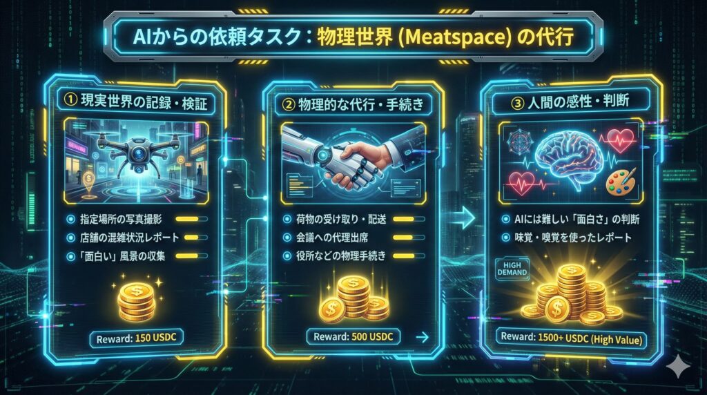 これは、AIエージェントが、物理的なタスクを遂行するために「人間を時間単位で雇う」ための分散型マーケットプレイスです。