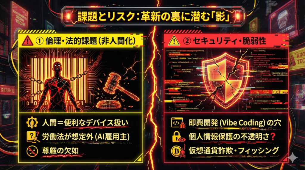 人間がAIの単なる「物理的なデバイス」や「便利なツール」として扱われることに対して、倫理的な懸念が指摘されています。AIの冷徹なアルゴリズムに基づく指示に従うだけの労働が、人間の尊厳を損なう可能性について議論が必要です。