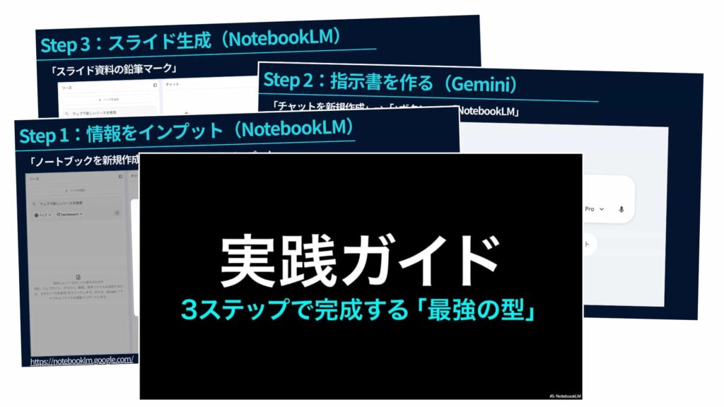 Step 3:スライド生成(NotebookLM):Geminiが作成したプロンプトで、NotebookLMにスライドを生成させる。