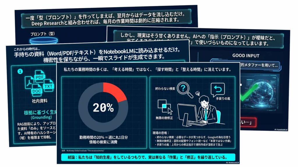 そこで、本資料では、GoogleのAI「NotebookLM」と「Gemini」を高度に連携させ、資料作成の全工程を劇的に効率化する最新の手法を公開します。