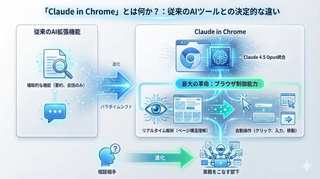 1. 「Claude in Chrome」とは何か?:従来のAIツールとの決定的な違い