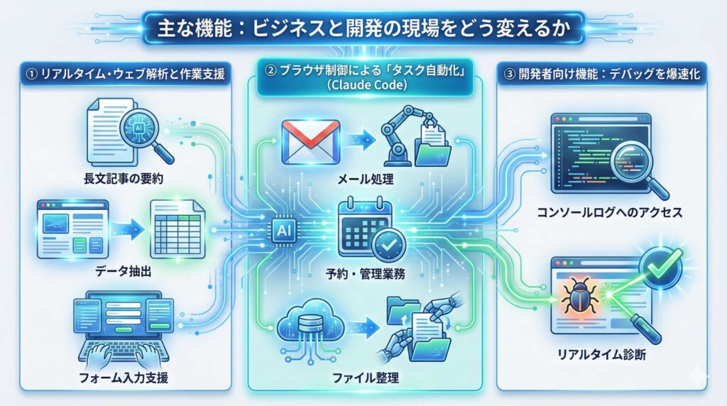 「Claude in Chrome」は、生産性を追求するビジネスパーソンや開発者にとって強力な武器となります。主な機能を見ていきましょう。
