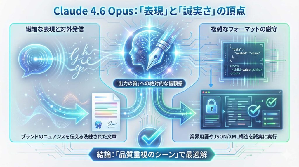 「クライアントにそのまま提出できるレベルの文章が欲しい」「細かいレギュレーションを絶対に守らせたい」という品質重視のシーンでは、Claude 4.6 Opusが最適解です。
