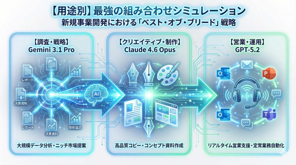 AIを真に使いこなす上級者は、単一のモデルに依存しません。タスクのフェーズに応じて最適なモデルを切り替える「ベスト・オブ・ブリード」戦略が有効です。新規事業開発を例に見てみましょう。