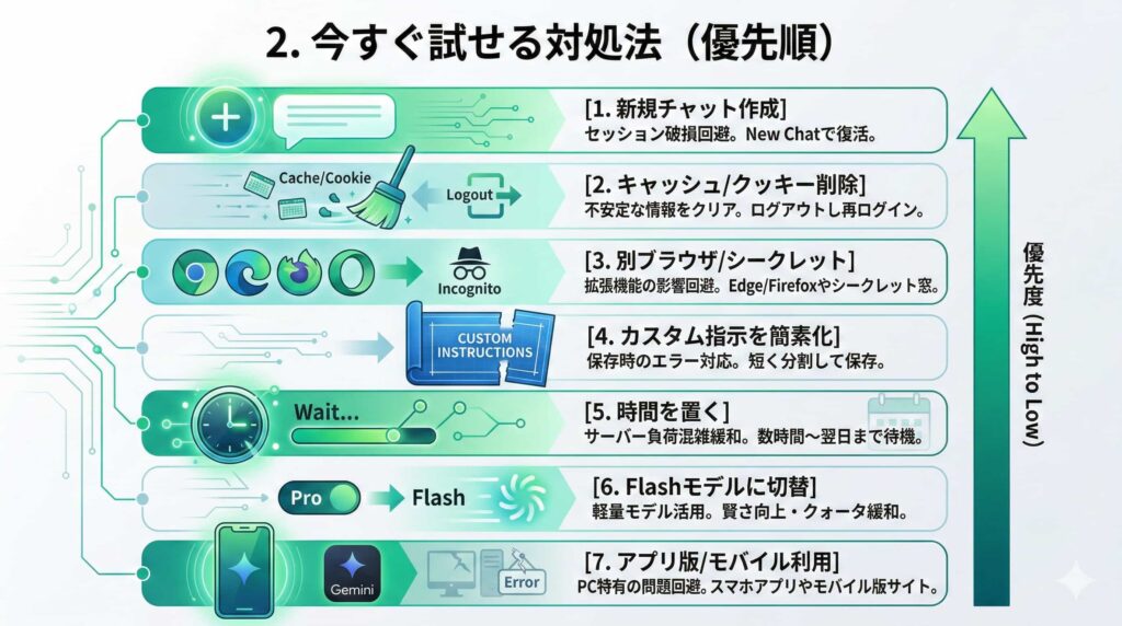 エラーに直面した際は、慌てず新規チャットを作成する、ブラウザのキャッシュ/クッキーを削除する、シークレットモードや別のブラウザで試す、といった対策を優先順に試してください。これらで多くの場合解消しますが、改善しない場合はGoogle側のサーバー負荷や一時的なバグの可能性もあるため、時間を置いてから再試行するか、クォータの緩いFlashモデルを活用してしのぐのが賢明です。