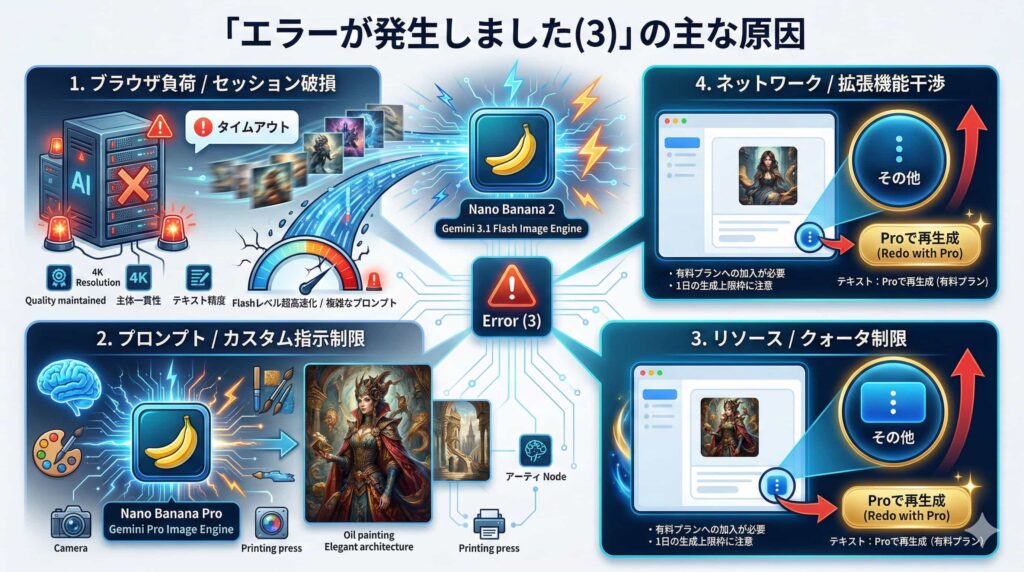 特に画像生成モデル「Nano Banana 2」がデフォルト化された2月26日以降、画像生成やThinkingモードでのリソース消費が激しくなり、エラー(3)が連発するようになったという声があります。