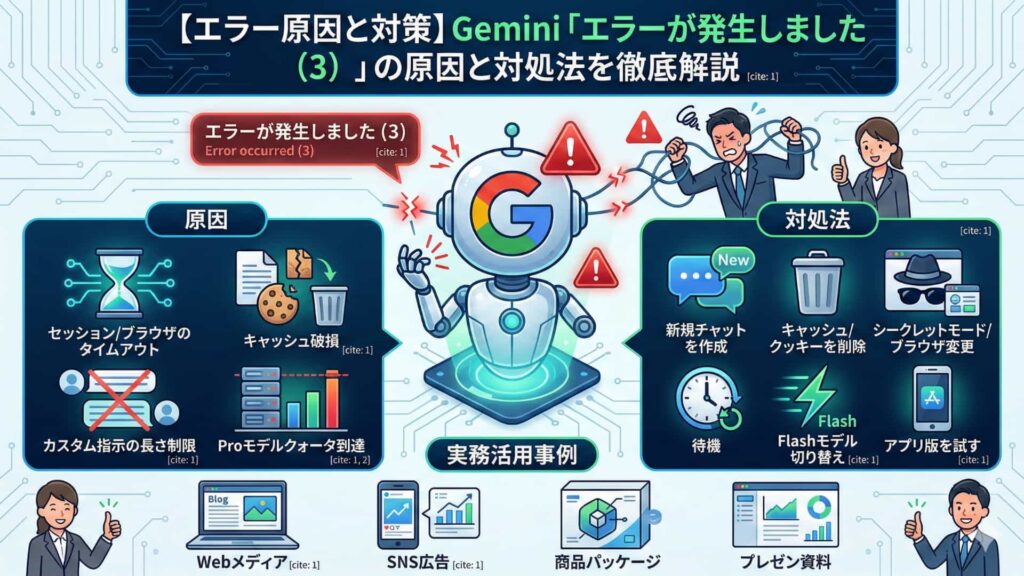 Geminiで頻発する「エラーが発生しました(3)」は、主にブラウザのセッション不安定やキャッシュ破損によって引き起こされる、汎用的なクライアント側エラーです。