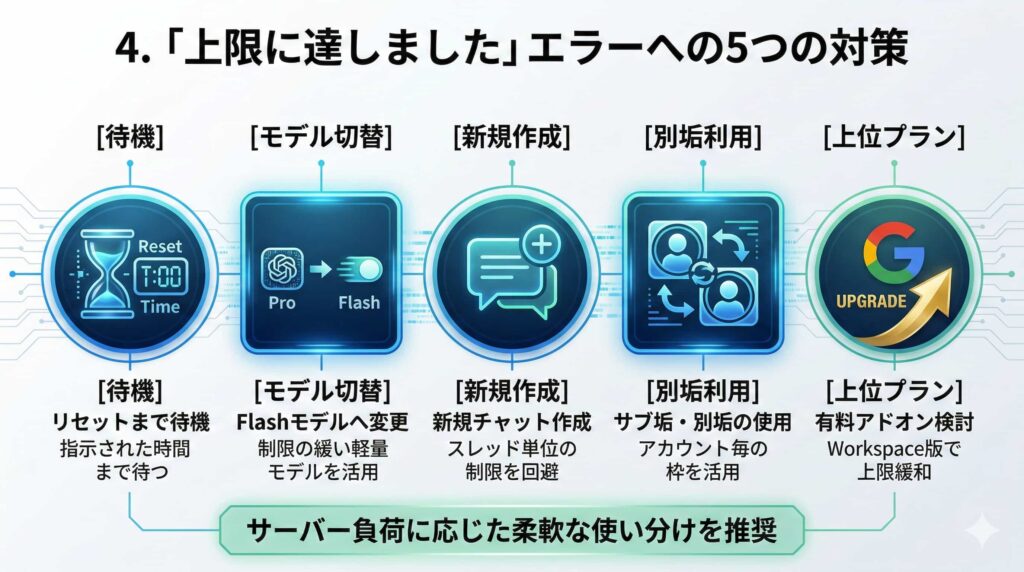 Gemini側は、これらの制限をサーバー負荷分散と公平利用のためとしています。現状、このエラーに直面した場合の具体的な対策は以下の通りです。