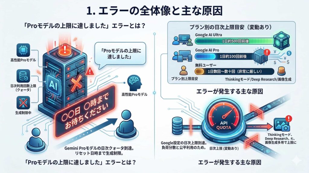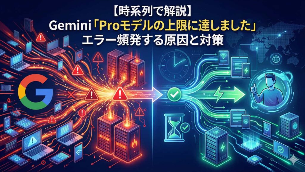 【時系列で解説】Gemini「Proモデルの上限に達しました」エラー頻発する原因と対策