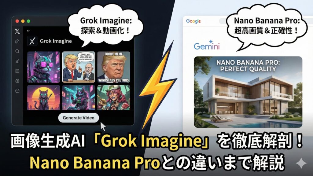 本記事では、「Grok Imagineとは何か?」という基本的な疑問からスタートし、実際の使い方、そしてGoogleの最高峰モデル「Nano Banana Pro」との詳細な比較、さらには具体的な活用方法まで、その全貌を網羅的に解説します。