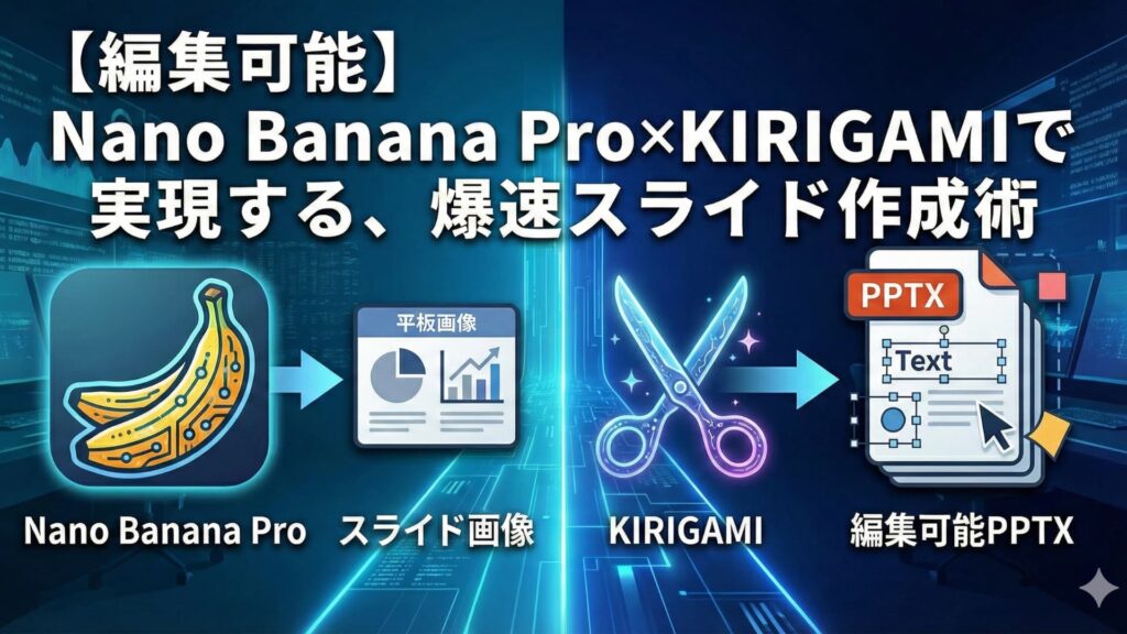 この記事では、Nano Banana Proで生成した画像をKIRIGAMIで編集可能なPowerPointファイルに変換し、スライド作成を劇的に効率化する方法を解説します。