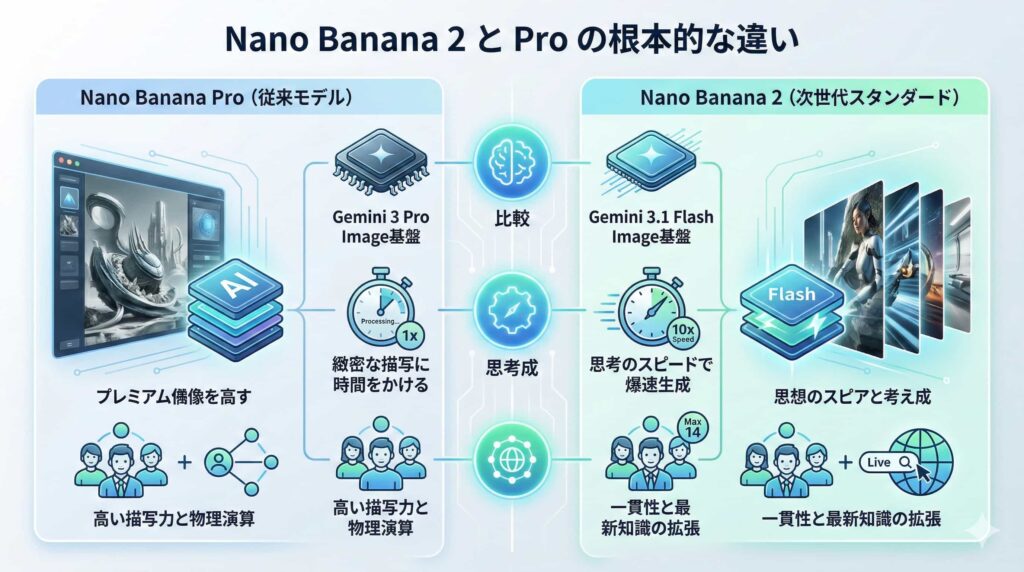 | 比較項目 | Nano Banana 2 (最新) | Nano Banana Pro (従来) |