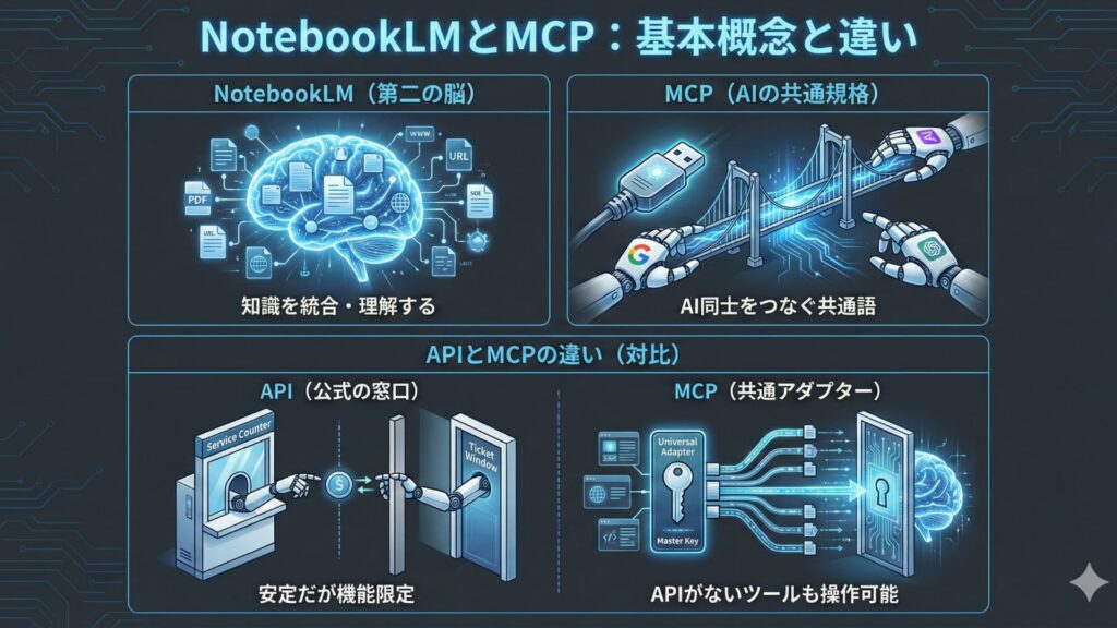 「外部からツールを操作する」という意味では似ていますが、アプローチが異なります。2026年現在、NotebookLMには公式APIが広く提供されていません。そこで、MCPという技術を使うことで、「APIがないNotebookLMを、AIエージェントから直接操作可能にする」という画期的な連携が実現したのです。
