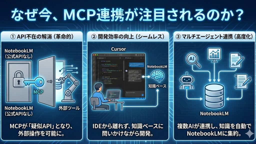 公式APIがないNotebookLMの機能を、MCPが「疑似API」のように振る舞うことで、外部プログラムからの操作を可能にした点が最大の革命です。