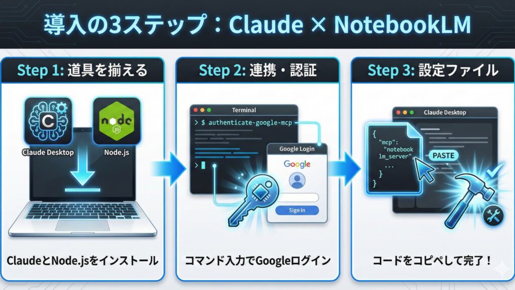 専門的な知識がなくても、以下の手順で「ClaudeにNotebookLMを操作させる」環境が作れます。