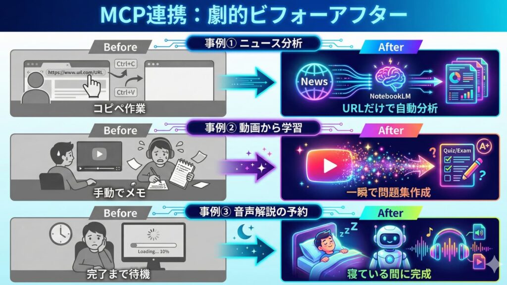 MCPによる活用: 「明日の会議で使う資料3つをノートに追加して、移動中に聞ける音声解説(Audio Overview)を生成しておいて」と指示。あなたが寝ている間に、AIがポッドキャストの準備を整えてくれます。