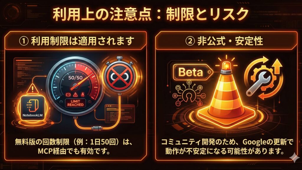 利用制限: NotebookLMの無料版アカウントでは「1日50回の質問」などの制限があります。MCP経由の操作でもこの制限は適用されるため、短時間に大量の処理をさせるとエラーになることがあります。