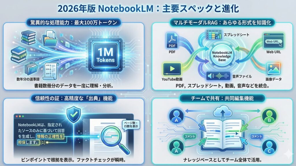 2024年のリリース当初から、NotebookLMは劇的な進化を遂げています。2026年現在の主要スペックとRAG機能の進化点を見ていきましょう。