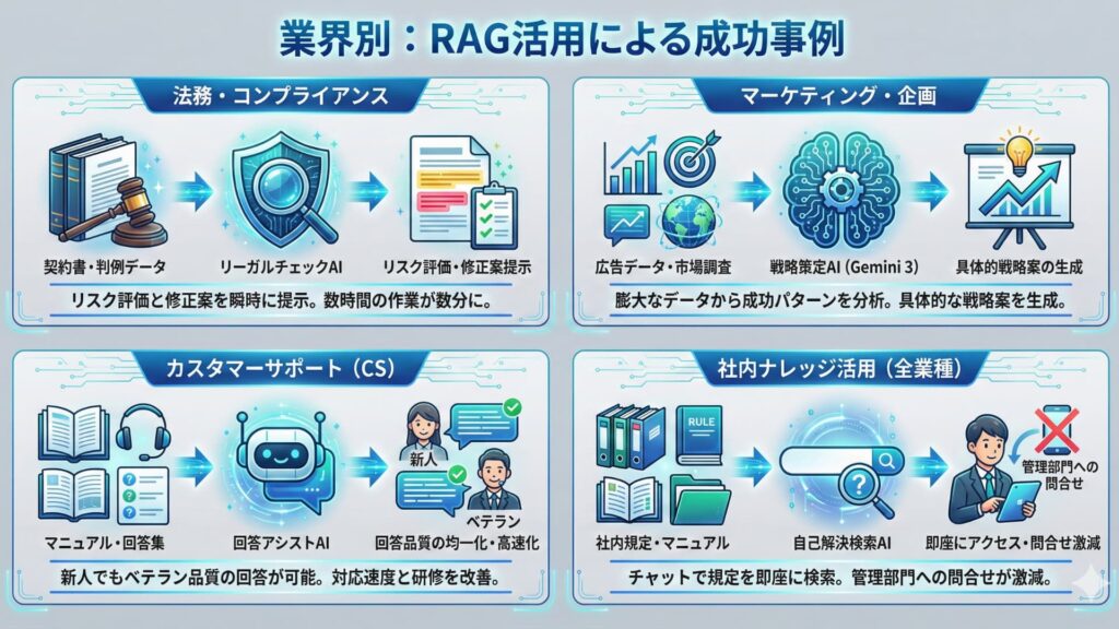 NotebookLMによるRAG構築は、プログラミング不要という手軽さから、既に多くの業界・職種で業務効率化を実現しています。ここでは代表的な成功事例を具体的に紹介します。