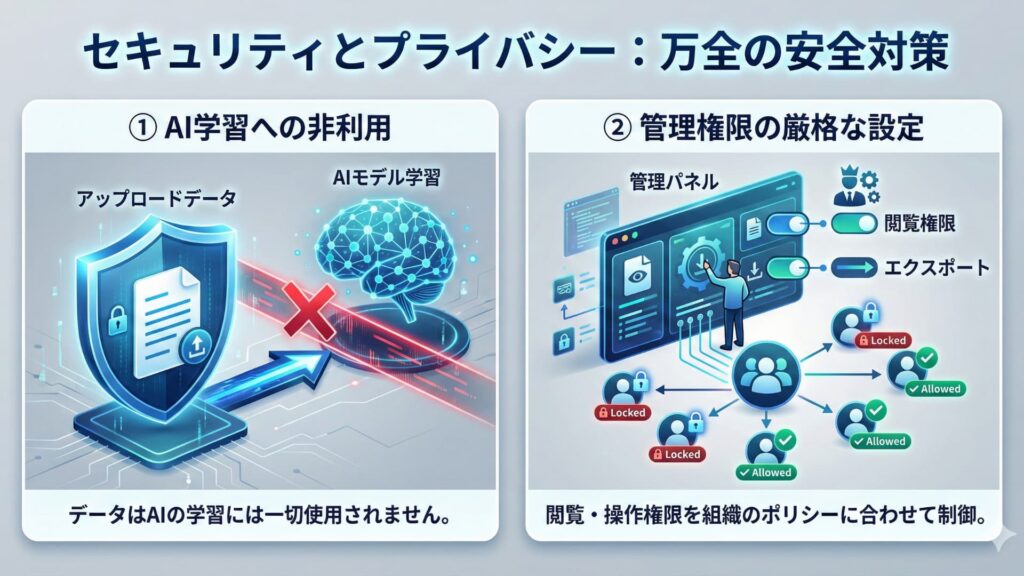 Enterpriseプランなどでは、管理パネルからデータの閲覧・エクスポート権限を細かく設定可能です。厳格な統制が必要な組織でも安心して利用できます。