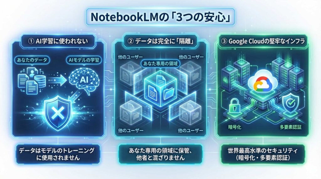 2. NotebookLMの「3つの安心」:データはAI学習に使われない!