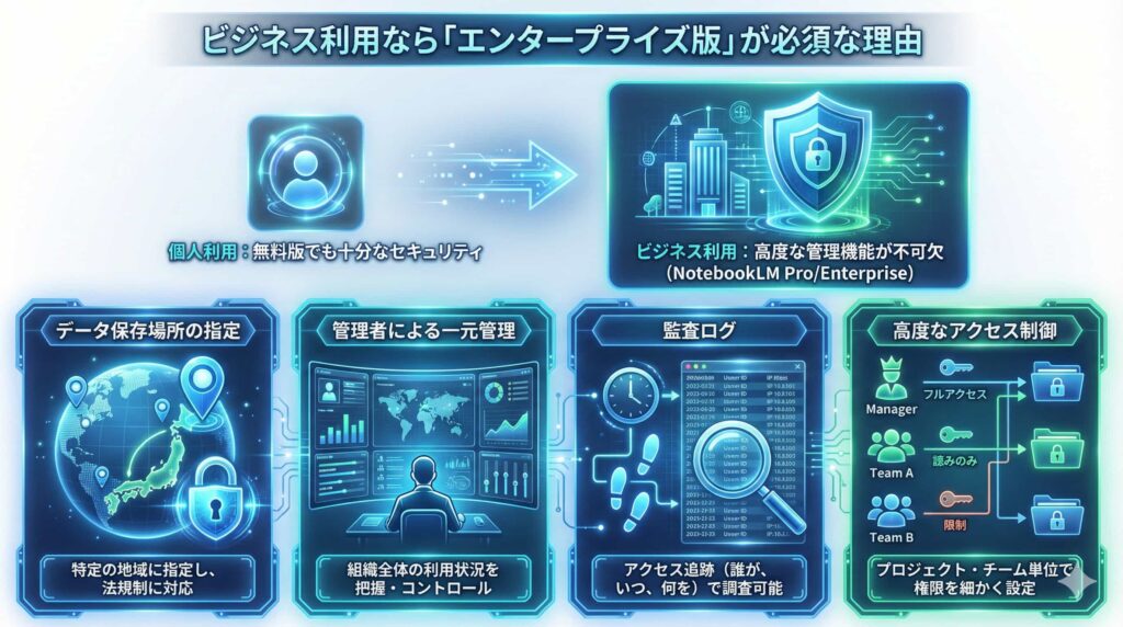 個人利用の範囲であれば無料版でも十分なセキュリティが担保されていますが、企業で導入する場合は、ビジネス・エンタープライズ向けプラン(NotebookLM Pro/Enterprise)の検討が不可欠です。