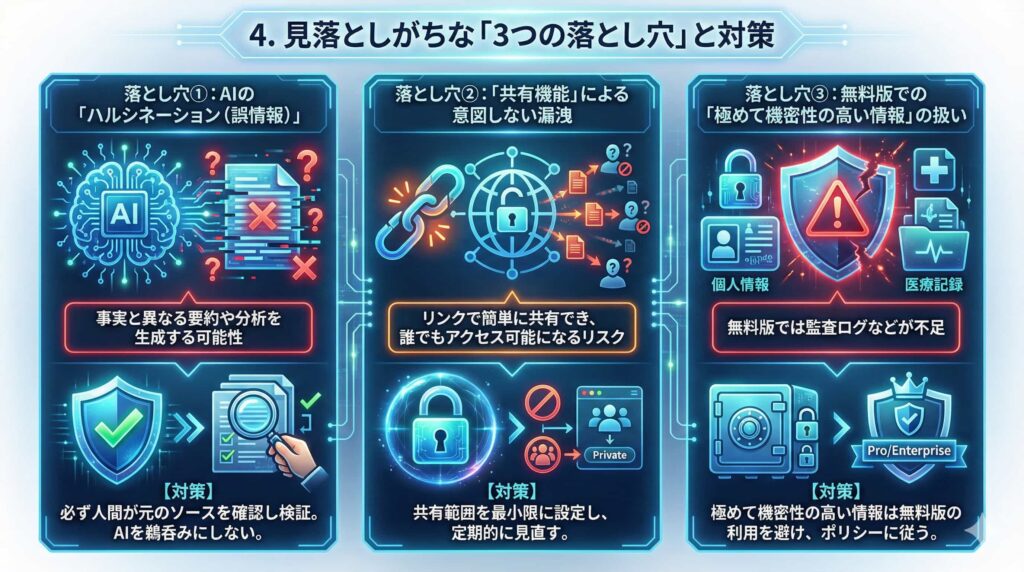 【対策】: 企業の存続に関わるような極めて機密性の高い情報、個人情報、医療記録などをアップロードする際は、無料版の利用は避け、組織のセキュリティポリシーに従って慎重に判断してください。