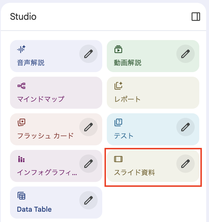 Studioパネル内にある「スライド資料」ボタン(鉛筆マーク)をクリックします。