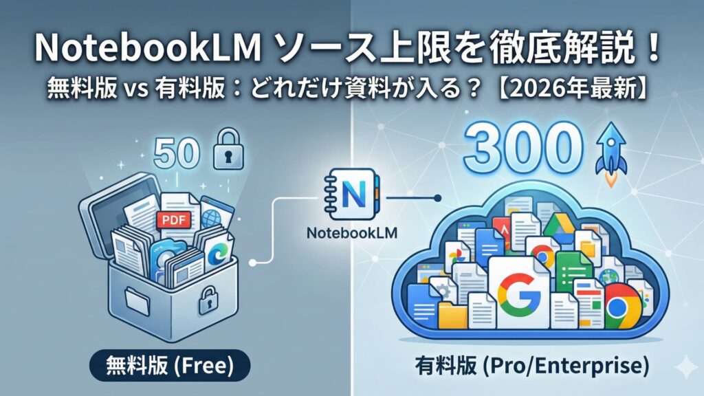 そこで本記事では、2026年1月時点の最新情報に基づき、NotebookLMのソース上限を徹底解説します。無料版と有料版の違い、上限到達時の対処法など、必須知識を網羅します。