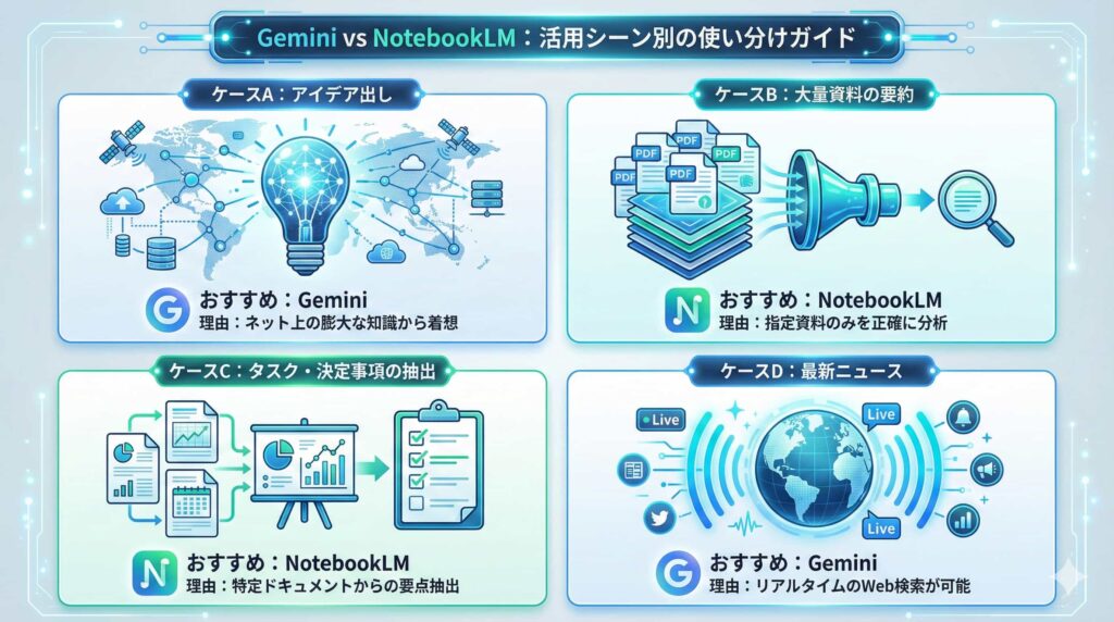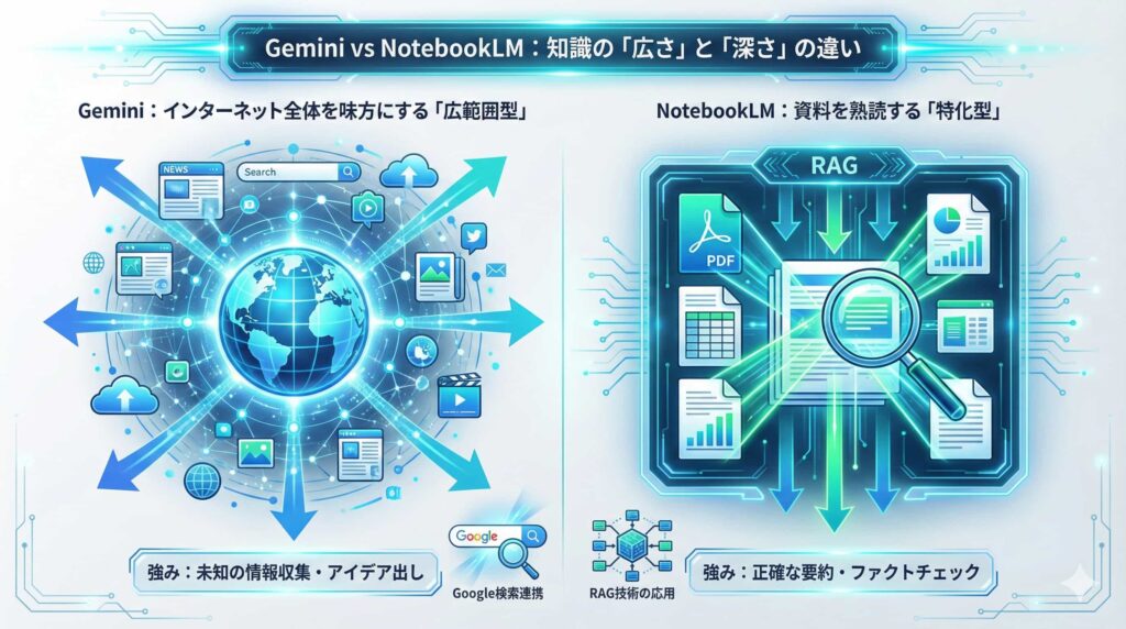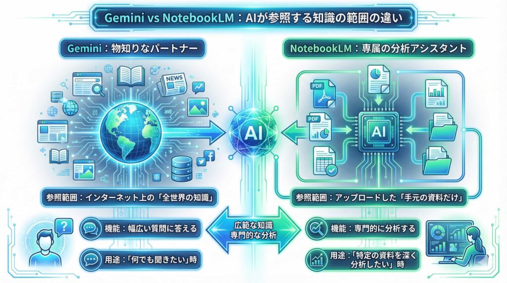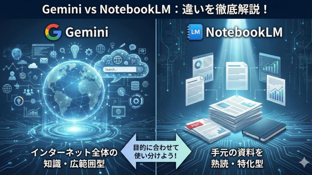GeminiとNotebookLMは、どちらが優れているというわけではなく、「目的が違うツール」です。