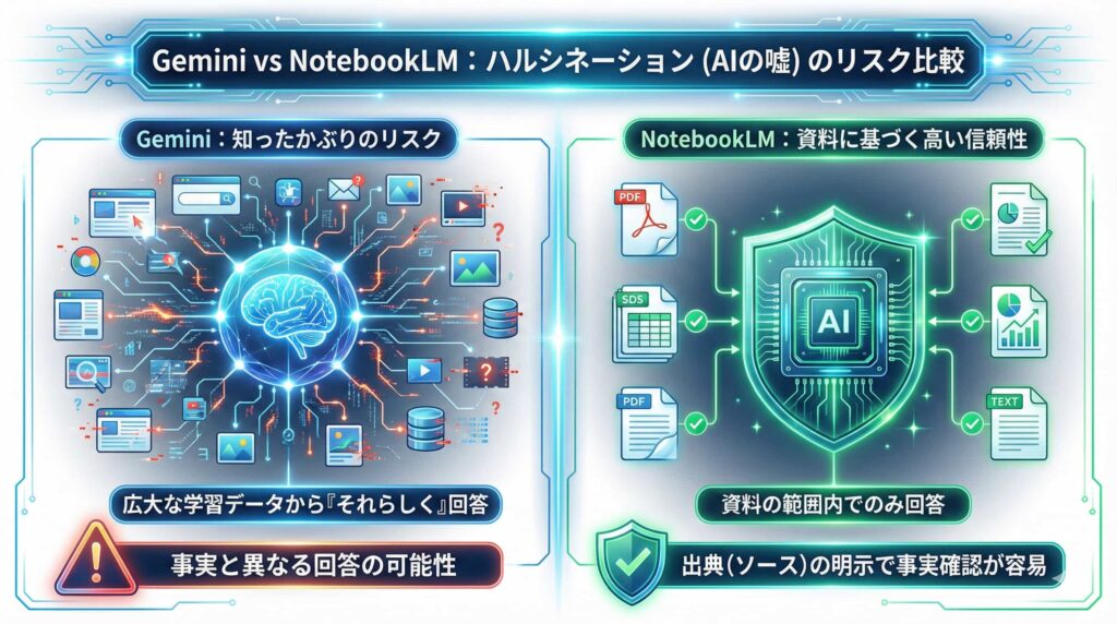 AIを利用する上で避けて通れないのが「ハルシネーション(もっともらしい嘘)」のリスクです。この点においても、両者には大きな違いがあります。