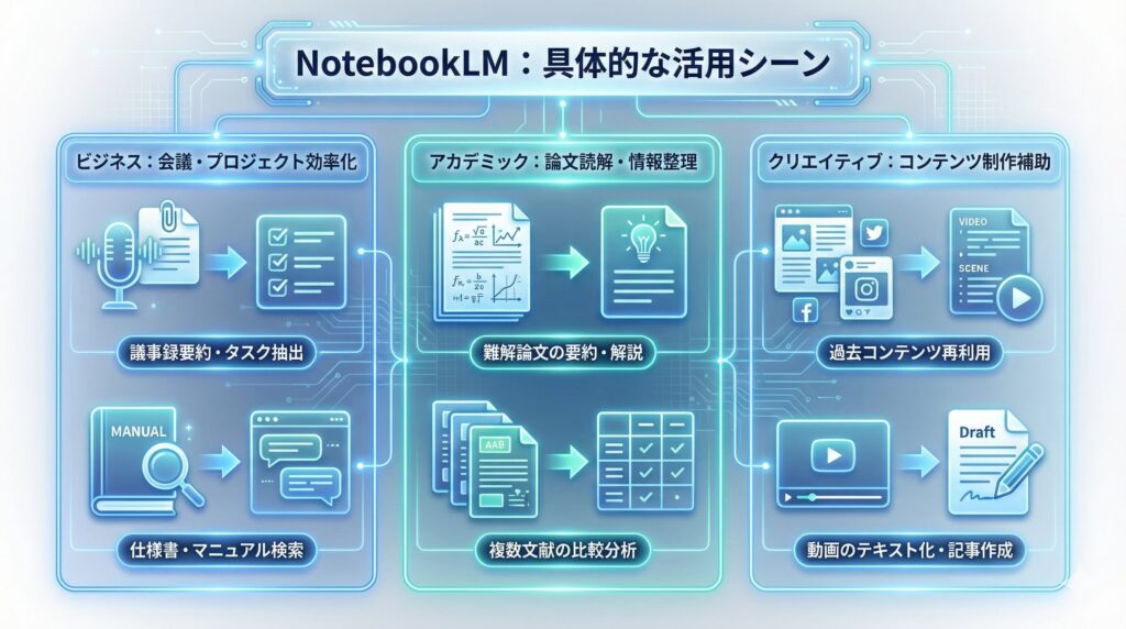 NotebookLMは、ビジネスからアカデミックまで、情報処理が必要なあらゆるシーンで活用できます。